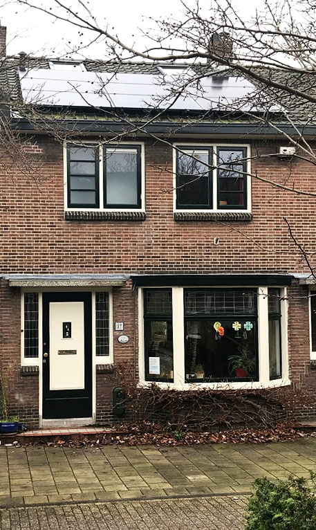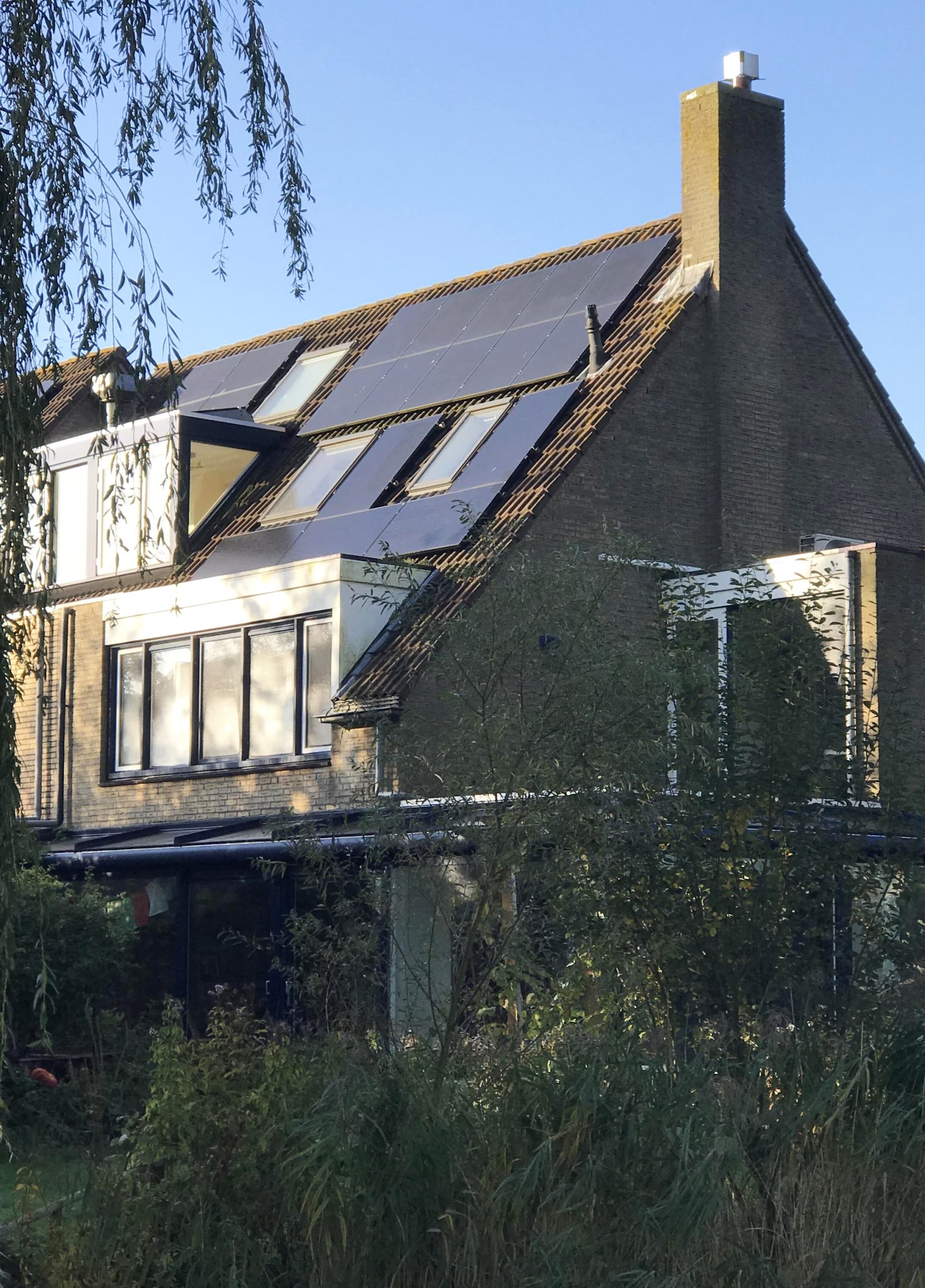 CO2-neutrale woning door laag gasgebruik en groot overschot aan zonnestroom door 30 PV-panelen en 2.000 kWh aandeel in collectieve windmolen.