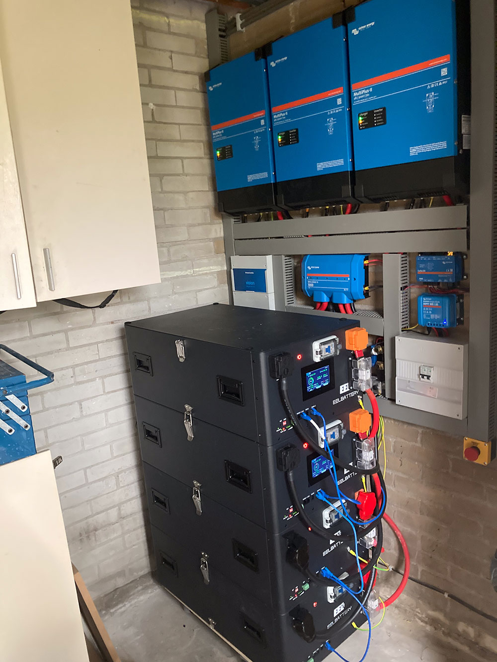 Batterijen / Energie management 15kW/60kWh Victron ESS accusysteem en HEMS (home energy management system) voor zonnestroom opslag voor later gebruik en teruglevering; in de winter zoveel mogelijk windstroom gebruik