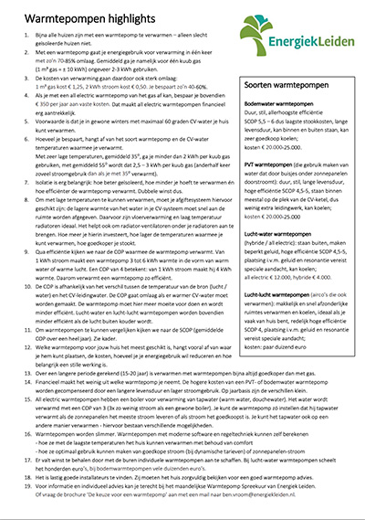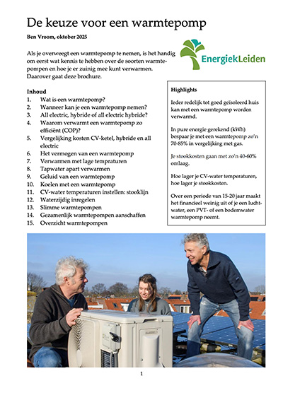 Uitgebreide informatie over soorten warmtepompen, de werking ervan, kosten, efficiëntie (COP’s), het verschil tussen all electric of hybride, laagtemperatuurverwarming, de verwarming van tapwater en geluid.